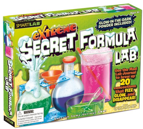 SMARTLAB-Extreme Secret Formula Kit. Kids try their hand at mad science using a beaker; funnel; mix-and-measure scoop; squishy- lidded bubble test tubes; and an abundance of glow-in-the-dark powder to concoct 20 experiments that glow; ooze; and stink up the kitchen. From glow-in-the-dark alien blood to scratch-and-sniff stickers; young scientists will never have so much fun with custom- designed tools and commonly found household ingredients! This kit includes 2 test tubes; 3-piece stand; mixing bowl; beaker; eyedropper; sticker sheet; measuring scoop; funnel; 8 grams of glow- in-the-dark powder and instructions. Recommended for ages 8 and up. WARNING: CHOKING HAZARD: Small parts. Not for children under 3 years. WARNING: This set contains chemicals that may be harmful if misused. Adult supervision required. Imported.