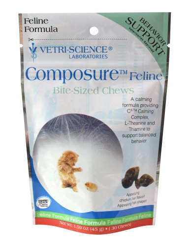 When humans are exposed to new environmental stressors like a new job or the in-laws visits, we can relax with a warm bath, a cup of tea, or a soothing song. When cats are exposed to similar stressors (like a car ride or a new baby), their options for relaxation are fewer. Anxiety can run high in cats who are unwittingly placed in different environmental situations, causing actions like incessant scratching, noise-making, urine marking or aggressive behavior. Composure Feline Bite-sized Chews are formulated to address these habits and the anxiety that leads to their proliferation.